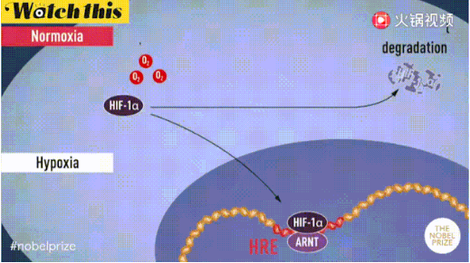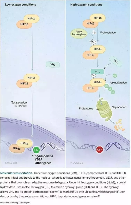 獲獎?wù)咧坏腟emenza教授在培育的肝細(xì)胞中發(fā)現(xiàn)了一種蛋白質(zhì)復(fù)合物以一種氧依賴性的方法與已判定出的 DNA 片段結(jié)合,開啟某些基因的表達(dá)。他稱這種復(fù)合物為缺氧誘導(dǎo)因子(HIF),是一個轉(zhuǎn)錄因子。HIF蛋白在低氧氣濃度時會積累,使細(xì)胞開啟應(yīng)對低氧環(huán)境的系列基因表達(dá);而在氧氣濃度高的時候,HIF會發(fā)生羥基化,然后該因子被泛素蛋白酶體系統(tǒng)降解。如此,細(xì)胞可以通過感知氧氣并對HIF的調(diào)節(jié),實(shí)現(xiàn)對細(xì)胞中基因表達(dá)的控制,來應(yīng)對機(jī)體氧含量的變化。經(jīng)研究發(fā)現(xiàn) HIF 由兩種不同的 DNA 結(jié)合蛋白組成(即所謂的轉(zhuǎn)錄因子,現(xiàn)在稱為 HIF-1α和 ARNT)。