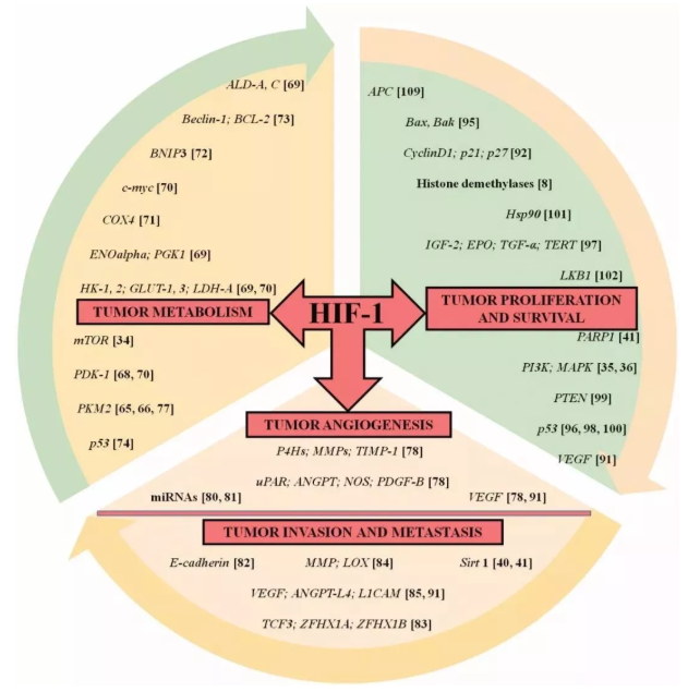 由于HIF-1調(diào)控的基因與腫瘤的代謝,增殖、生存和轉(zhuǎn)移,以及腫瘤血管增生息息相關(guān)。因此,抑制HIF-1蛋白和其相關(guān)蛋白(HIF-2α)的功能也成了抗癌藥物研發(fā)的重要方向之一。