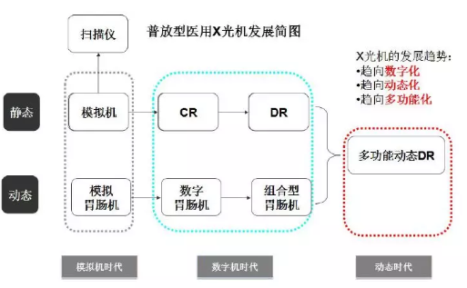 在靜態(tài)成像層面,X光機的發(fā)展經(jīng)歷了模擬機、CR、DR三個階段,成像速度越來越快,成像質(zhì)量越來越高。