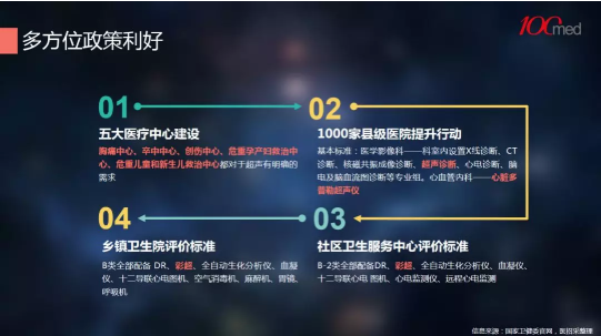 駱士濤總經(jīng)理在會議上提到,從2016年開始,各省相繼出臺相應(yīng)政策來加強基層建設(shè),國家也在去年和今年陸續(xù)出臺相關(guān)標(biāo)準(zhǔn)規(guī)定,這些年基層尤其以鄉(xiāng)鎮(zhèn)衛(wèi)生院為代表的市場是超聲行業(yè)最大的紅利市場。所以目前來看,超聲市場的紅利主要來自于基層、五大醫(yī)療中心建設(shè)以及財政支持的1000家縣級醫(yī)院的能力提升這三個方面,最大的來源是基層,包括鄉(xiāng)鎮(zhèn)衛(wèi)生院和社區(qū)醫(yī)院。