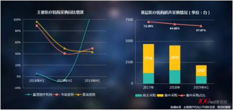從相關(guān)政策和以上數(shù)據(jù)圖表可以看出,在主要醫(yī)療機構(gòu)采購?fù)仍鏊龠@一方面,只有基層醫(yī)療機構(gòu)有大幅度的增長。而從年份來看基層醫(yī)療機構(gòu)超聲采購情況,采購數(shù)量逐年減少,而政府的集中采購與醫(yī)療機構(gòu)的自主采購的比例也同樣在下降。