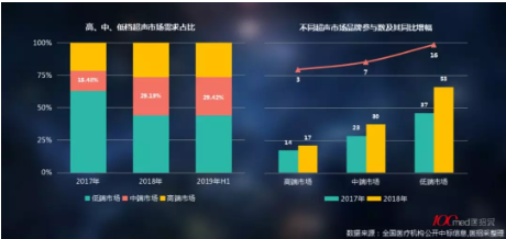 2017年,低端超聲市場需求占比較大,2018年和2019年上半年,三個層次的市場比例則相對較為穩(wěn)定。實際上,低、中、高端市場都在競爭超聲市場的增長與擴容,希望分得一塊蛋糕,不僅僅在基層,同樣在市級、縣級醫(yī)院也會產(chǎn)生一定的增量。隨著整個超聲市場的增長和擴容,加入的品牌也越來越多。