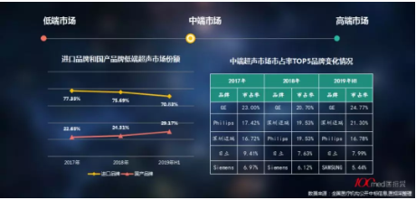 高端超聲市場中,2019年上半年,進口品牌占將近92%,GE第一的地位幾乎無人能撼動,2017到2019上半年,其高端市場占有率一直保持30%以上,飛利浦緊隨其后。而能夠進入高端市場前列的國產(chǎn)品牌只有邁瑞一家,駱士濤對此表示進口替代任重道遠。隨著社區(qū)醫(yī)院在超聲方面的競爭進入中端市場,國產(chǎn)品牌的份額能否還能保得住也成為需要思考的問題,預(yù)計到2020年,我國超聲市場將進入進口替代的攻堅戰(zhàn)時期。