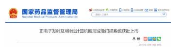 2019年12月19日,國家藥監(jiān)局發(fā)布消息,近日國家藥監(jiān)局批準(zhǔn)上海聯(lián)影醫(yī)療科技有限公司研制的創(chuàng)新醫(yī)療器械 “正電子發(fā)射及X射線計(jì)算機(jī)斷層成像掃描系統(tǒng)”。