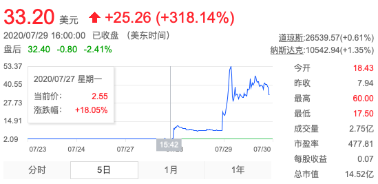 7月29日晚,美股市場上,柯達(dá)的股價(jià)再度暴漲逾318%,盤中20次觸發(fā)熔斷,一度漲至59.98美元的高點(diǎn),漲超650%,創(chuàng)7年新高。從7月27日開盤2.13美元到29日收盤33.20美元,3天累計(jì)上漲1480%,市值暴增13.6億美元。