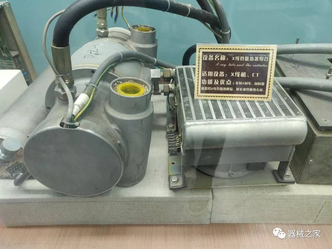 由于X線機產(chǎn)生X射線的過程中只有百分之一的動能轉化為X射線,其余的能量都以熱能的形式散失。這就需要良好的散熱設備,也就是這個散熱器。散熱器大多采用油冷。變壓器油不僅絕緣,而且能夠吸收散亂射線,防止擊穿。使用時,一般會用油泵將冷油泵入到球管周圍,將熱油從另一管導出,在冷卻板上冷卻,循環(huán)利用。