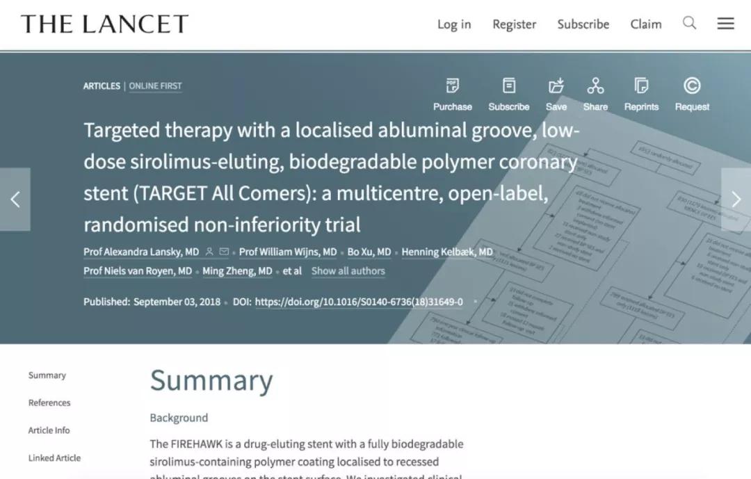 最終的試驗結(jié)果證明中國醫(yī)療器械此行確實(shí)底氣十足?;瘊椬鳛榈谌邢蛩幬锵疵撝Ъ?,證明了患者植入后,受到治療的血管區(qū)域能夠在早期快速愈合,因為其創(chuàng)新性的微槽包裹藥物、生物可降解聚合物的設(shè)計,以及較低的載藥量(僅需同類產(chǎn)品三分之一的載藥量即可實(shí)現(xiàn)同等療效),安全性大幅增加,可有效減少晚期血栓事件的發(fā)生,達(dá)到了世界頂尖水平。如今,這些結(jié)論登上了《柳葉刀》,中國智造的“吶喊”迅速在全球醫(yī)學(xué)界傳播開來。