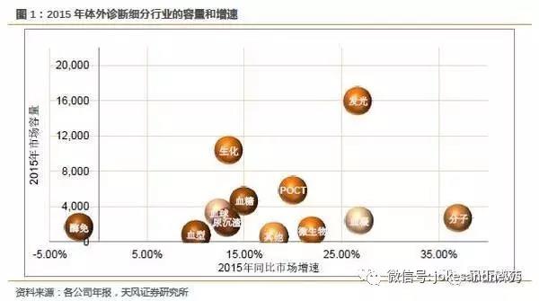 由上圖看出,從市場(chǎng)容量和行業(yè)增速兩個(gè)維度來(lái)看,化學(xué)發(fā)光細(xì)分具有良好的投資價(jià)值潛質(zhì)。2015年化學(xué)發(fā)光市場(chǎng)容量160億,占整個(gè)體外診斷行業(yè)30%以上,2015年行業(yè)增速27%,未來(lái)3-5年仍具備較高的行業(yè)景氣度。