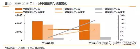 2016年1-4月一級(jí)醫(yī)院數(shù)量激增,同比2015年增長(zhǎng)24%,而2015年同比增長(zhǎng)9%。醫(yī)院數(shù)量不代表病人流向,但是作為標(biāo)桿數(shù)據(jù),可一定程度上表明政府的資金投入流向。而門診量則是分級(jí)診療成效的重要參考數(shù)據(jù)。