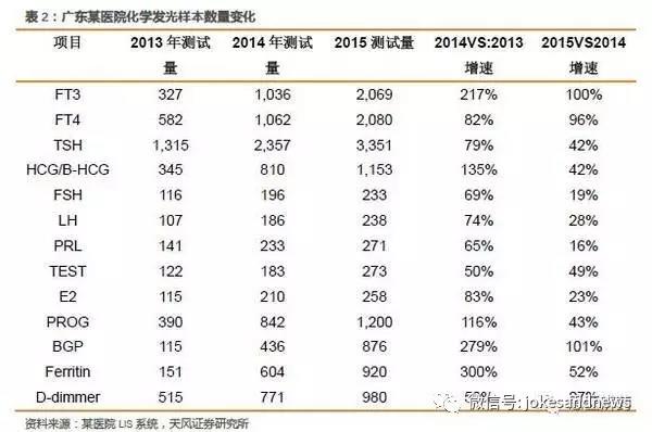 廣東省某基層醫(yī)院,一級(jí)甲等,2014年檢驗(yàn)科收入約為1000萬(wàn)。2013年開始使用國(guó)產(chǎn)全自動(dòng)發(fā)光儀,開展項(xiàng)目主要為甲功、激素兩個(gè)套餐。2015-2013年樣本增量變化如下。
