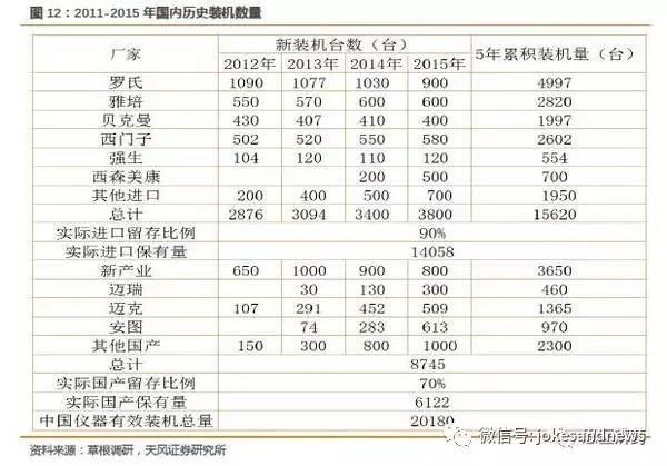 根據(jù)以上邏輯,我們大致可以測(cè)算目前的存量市場(chǎng),發(fā)光還未完全滿足終端需求,2015年儀器保有量來(lái)看,只滿足了60%的需求。而未來(lái)需求端的增長(zhǎng)依然保持極高的增速,除了進(jìn)口企業(yè),少量國(guó)產(chǎn)優(yōu)秀品牌可以分享藍(lán)海市場(chǎng),儀器裝機(jī)依然有很大的空間待開發(fā)。