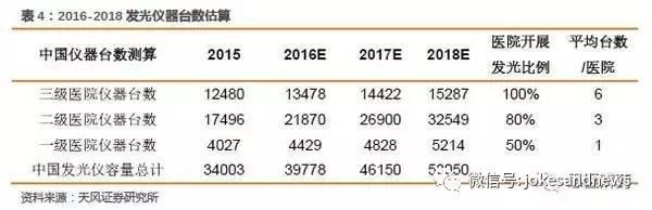2016年化學(xué)發(fā)光市場(chǎng)容量接近200億,國(guó)產(chǎn)占比不到20億,但是只考慮總的市場(chǎng)容量是不合理的,因?yàn)橐阅壳皣?guó)產(chǎn)水平難以和進(jìn)口競(jìng)爭(zhēng),所以我們分析市場(chǎng)有效空間。