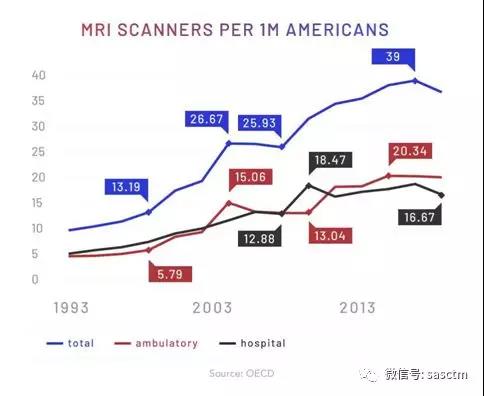 到2016年,平均每1千名美國(guó)人大約接受了121次MRI掃描檢查。而在加拿大和澳大利亞,這一數(shù)字分別是56和43次。最近的觀點(diǎn)是MRI是美國(guó)過于昂貴的醫(yī)保支付系統(tǒng)的終極力證。成為了拖垮美國(guó)醫(yī)保費(fèi)用的“原罪”之一。