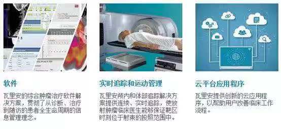 瓦里安提供的服務(wù)主要是其為放療系統(tǒng)開發(fā)的一系列輔助手段,包括綜合腫瘤治療軟件、放療實時追蹤和運動管理系統(tǒng)以及云平臺應(yīng)用。