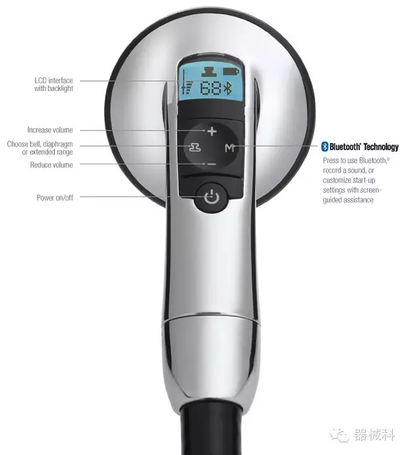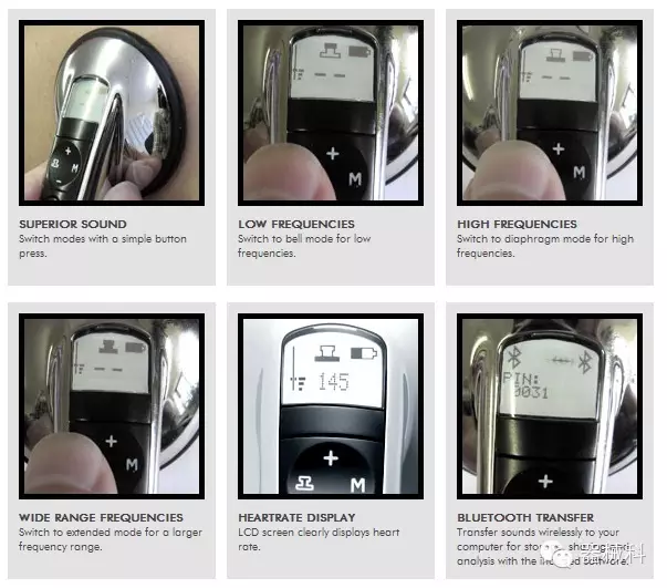 2009年,電子聽診器的發(fā)展達到了新的巔峰,Littmann®3200型電子聽診器(上圖)出現(xiàn)在世人面前。這是首個運用藍牙技術(shù)的電子聽診器,它能夠?qū)⑿呐K、肺部和其他身體器官的信號無線傳送到醫(yī)師使用的電腦,并通過Cardioscan軟件實時地將聲音曲線顯示在電腦屏幕上,更準(zhǔn)確地揭示患者心臟可能存在的異?,F(xiàn)象。隨后,軟件會對聲波曲線進行分析,并將代表有害雜音的異常部分的細(xì)節(jié)突出顯示出來。醫(yī)師能夠?qū)⒒胤潘俣冉档鸵话雭砀屑?xì)地分析問題,還能將文件保存到患者的檢查結(jié)果中,并通過電子郵件和Scope to Scope遠(yuǎn)程聽診軟件,將其發(fā)送給心臟病專家來確認(rèn)診斷結(jié)果。這套系統(tǒng)不僅能夠準(zhǔn)確捕捉到危險的雜音,還能減少更為昂貴心電圖檢查費用和不必要的心臟病專家的診療工作。從此傳統(tǒng)的電子聽診器變成了先進的醫(yī)療工具,取代了醫(yī)師對心臟雜音的猜測,提高了診斷能力。隨后3M公司推出了一系列改良產(chǎn)品......目前這方面3M公司的最新產(chǎn)品是Littmann4100系列(下圖)