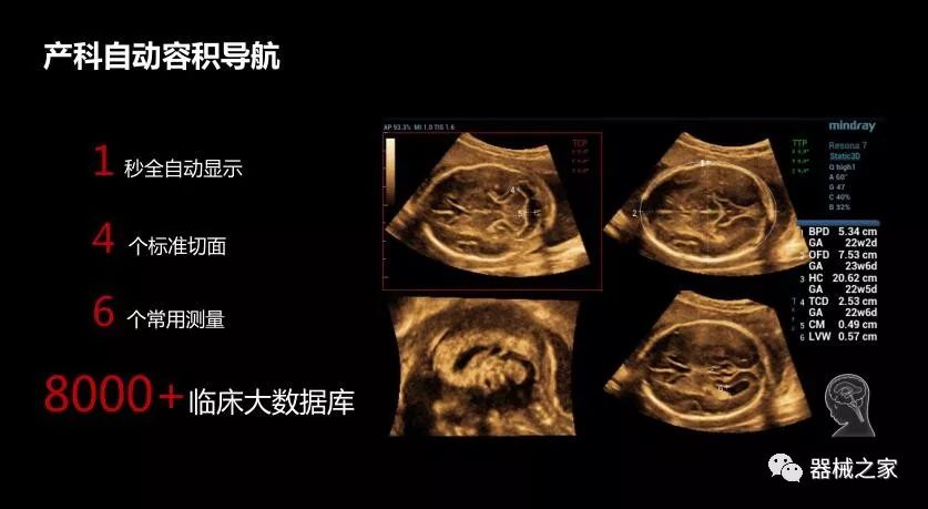 基于臨床大數(shù)據(jù)算法,女媧Resona 8在取得胎兒顱腦三維數(shù)據(jù)后,1秒的時(shí)間就可以直接顯示4個標(biāo)準(zhǔn)切面并進(jìn)行6個常用的測量。