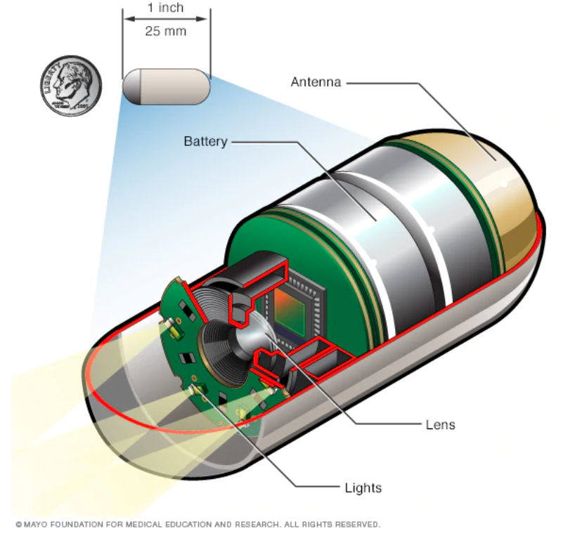 1997年,Gadi Iddan和Paul Swain分別領(lǐng)導(dǎo)的團(tuán)隊首次會面。1998年,這兩個團(tuán)隊展開了合作。1999年初,他們在以色列進(jìn)了了原型機試驗,隨后在Eitan Scapa的私人診所進(jìn)行了由Paul Swain親自進(jìn)行的第一次人體吞咽11*33毫米膠囊的人體實驗。實驗持續(xù)了2小時。為確認(rèn)膠囊通過了幽門,Paul Swain還進(jìn)行了胃鏡檢查。實驗的第二天,Paul Swain在他的旅館房間吞下了第二顆膠囊,膠囊抵達(dá)了盲腸,傳遞了6小時的高質(zhì)量圖像。