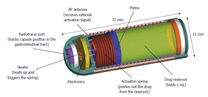 當(dāng)彈簧釋放時,Enterion能夠通過9毫米開口輸送任何類型的藥物配方(包括干粉,半固體,懸浮液或溶液配方),迫使活塞沿著膠囊的軸移動,從而,清空所述容器到胃腸道的特定位置。將放射性標(biāo)記物放置在單獨的密封示蹤劑端口內(nèi),以允許使用γ閃爍掃描法實時觀察膠囊位置?;钊倪\(yùn)動還操作開關(guān),該開關(guān)以精確的頻率傳輸弱無線電信號。這個信號的檢測從外部確認(rèn)膠囊已成功?;钊\(yùn)動在膠囊末端附近停止,這保持了密封并防止內(nèi)部電子元件與GI流體接觸。