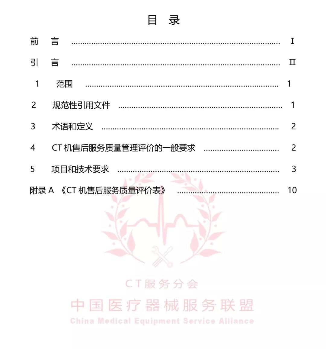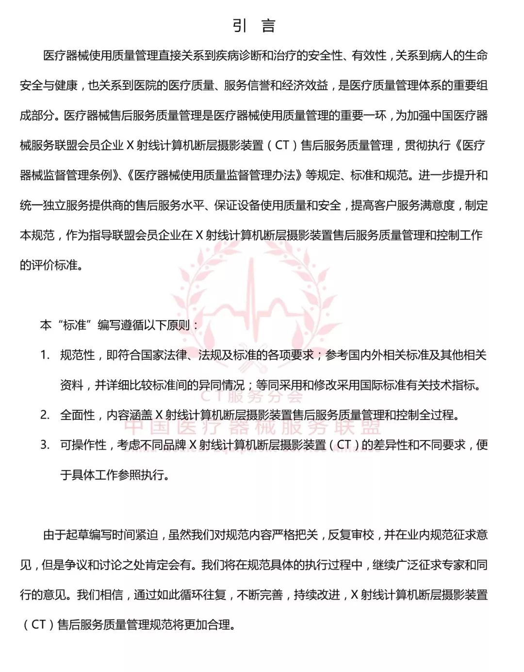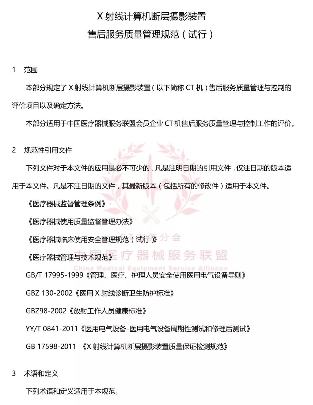 醫(yī)療器械售后服務(wù)質(zhì)量管理是醫(yī)療器械使用質(zhì)量管理的重要一環(huán),為加強(qiáng)e中國醫(yī)療器械服務(wù)聯(lián)盟會員企業(yè)X射線計算機(jī)斷層攝影裝置(CT)售后服務(wù)質(zhì)量管理,貫徹執(zhí)行《醫(yī)療器械監(jiān)督管理條例》、《醫(yī)療器械使用質(zhì)量監(jiān)督管理辦法》等規(guī)定、標(biāo)準(zhǔn)和規(guī)范,進(jìn)一步提升和統(tǒng)一獨(dú)立服務(wù)提供商的售后服務(wù)水平、保證設(shè)備使用質(zhì)量和安全,提高客戶服務(wù)滿意度,制定本規(guī)范,作為指導(dǎo)聯(lián)盟會員企業(yè)在X射線計算機(jī)斷層攝影裝置售后服務(wù)質(zhì)量管理和控制工作的評價標(biāo)準(zhǔn)。