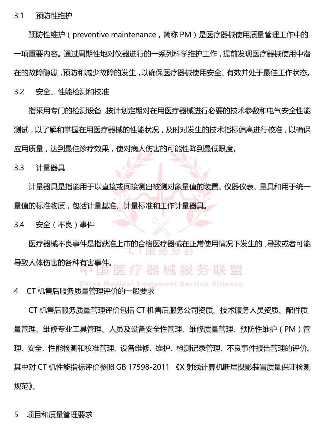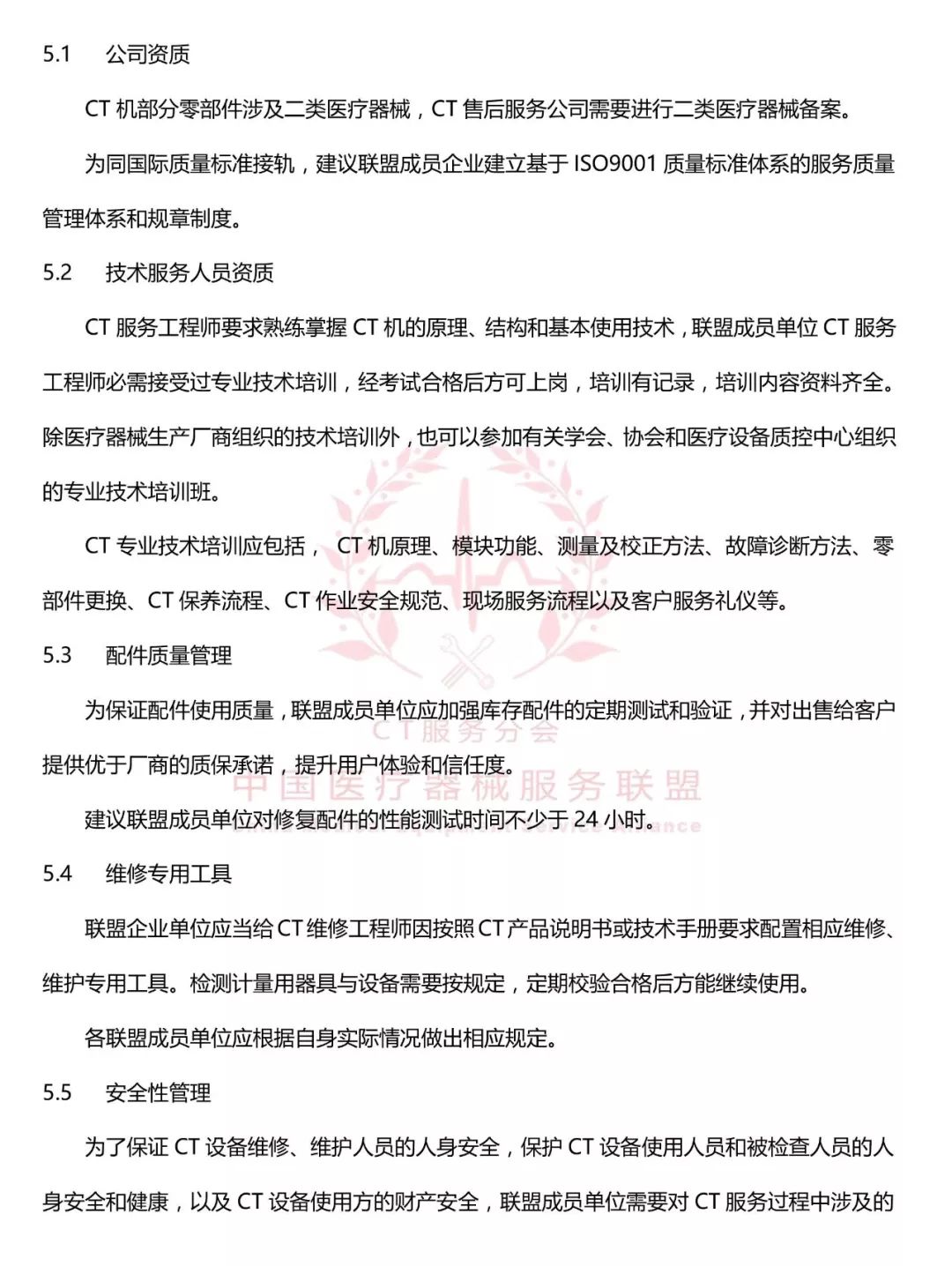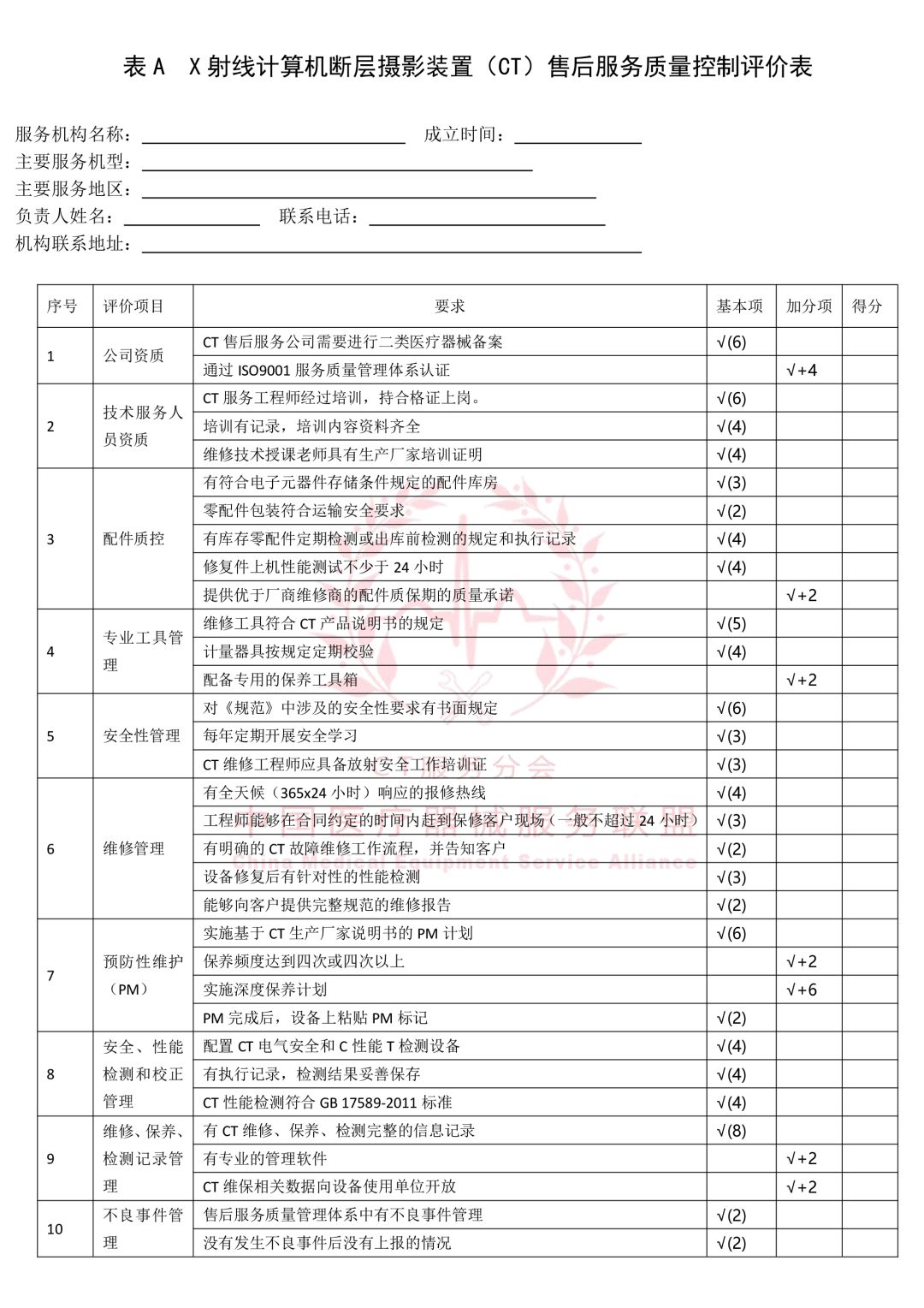 醫(yī)療器械售后服務(wù)質(zhì)量管理是醫(yī)療器械使用質(zhì)量管理的重要一環(huán),為加強(qiáng)e中國醫(yī)療器械服務(wù)聯(lián)盟會員企業(yè)X射線計算機(jī)斷層攝影裝置(CT)售后服務(wù)質(zhì)量管理,貫徹執(zhí)行《醫(yī)療器械監(jiān)督管理條例》、《醫(yī)療器械使用質(zhì)量監(jiān)督管理辦法》等規(guī)定、標(biāo)準(zhǔn)和規(guī)范,進(jìn)一步提升和統(tǒng)一獨(dú)立服務(wù)提供商的售后服務(wù)水平、保證設(shè)備使用質(zhì)量和安全,提高客戶服務(wù)滿意度,制定本規(guī)范,作為指導(dǎo)聯(lián)盟會員企業(yè)在X射線計算機(jī)斷層攝影裝置售后服務(wù)質(zhì)量管理和控制工作的評價標(biāo)準(zhǔn)。